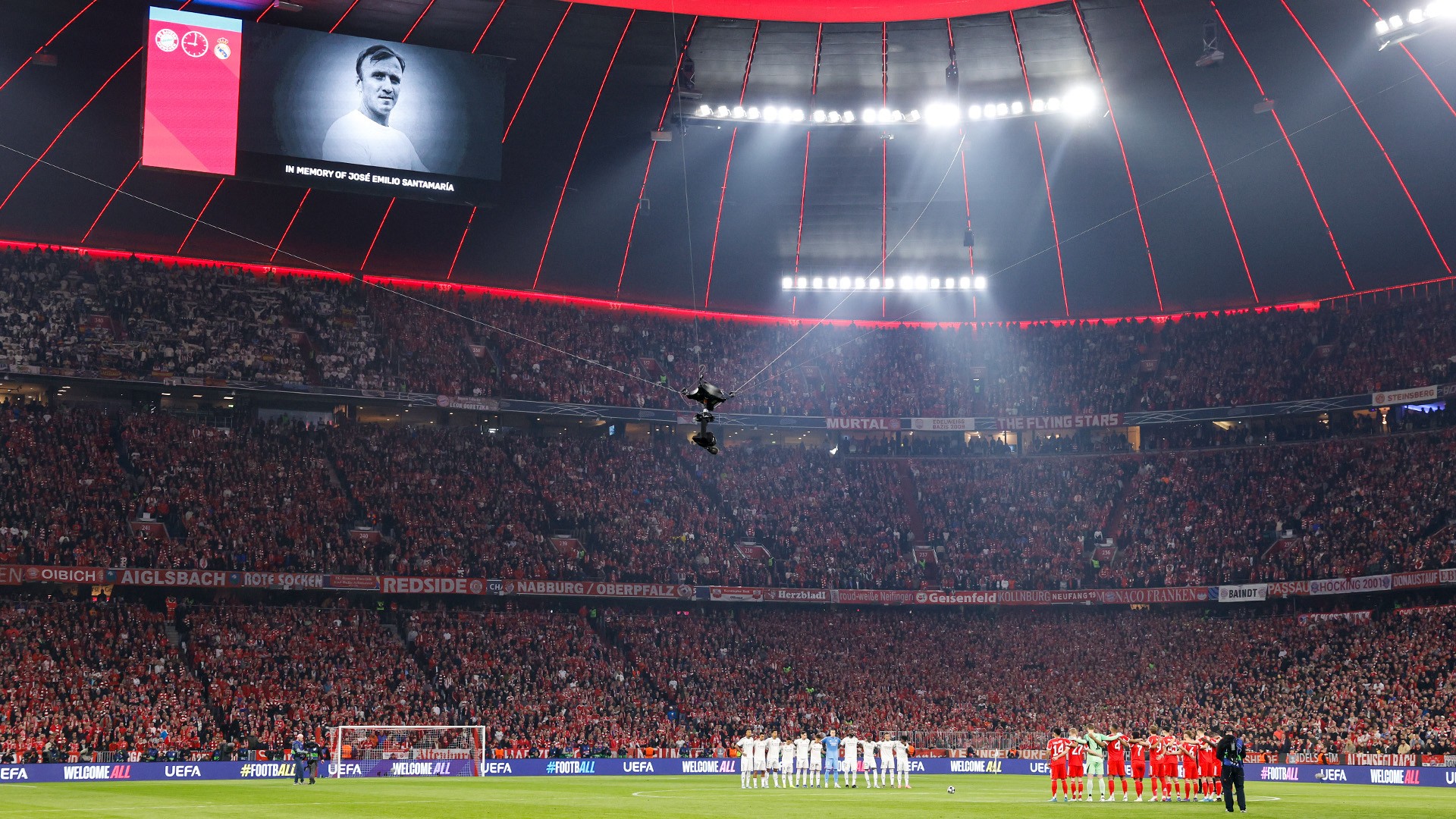 A müncheni mérkőzés előtt főhajtással emlékeztek az elhunyt José Emilio Santamaríára, az uruguayi születésű, spanyol válogatott labdarúgóra és edzőre, a Real Madrid legendás hátvédjére, aki Puskás Ferenc csapattársaként részese volt a klub aranykorának. Fotó: a Real Madrid közösségi oldala
