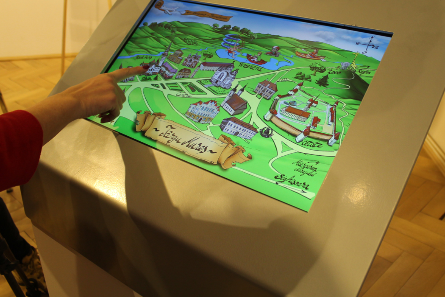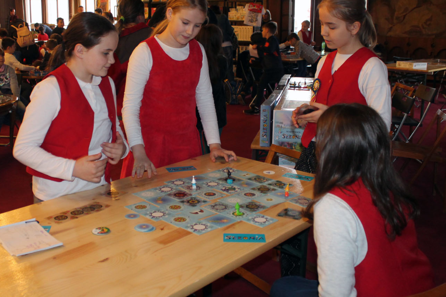 Kartonmezőkön lépkedő, kártyalapokat rakosgató,