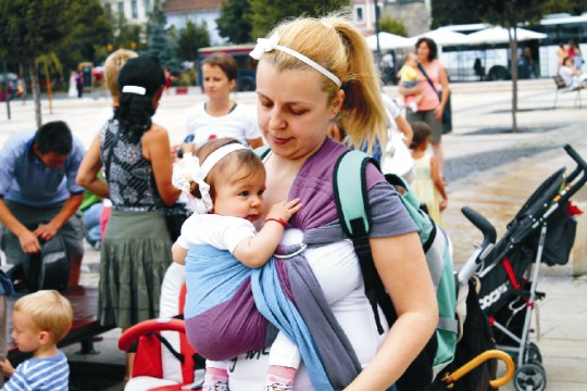 Fehér pólós édesanyák kendőben hordozott, illetve ölben tartott babákkal gyülekeztek hétfő délután a...