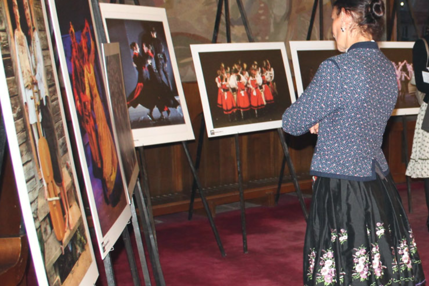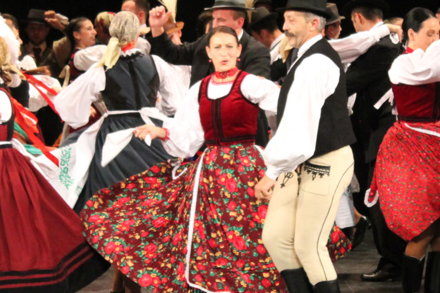 Népviseletben pompázó asszonyok, férfiak, fiatalok, táncospárok,